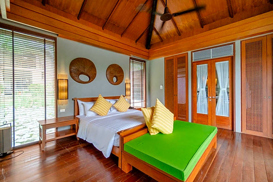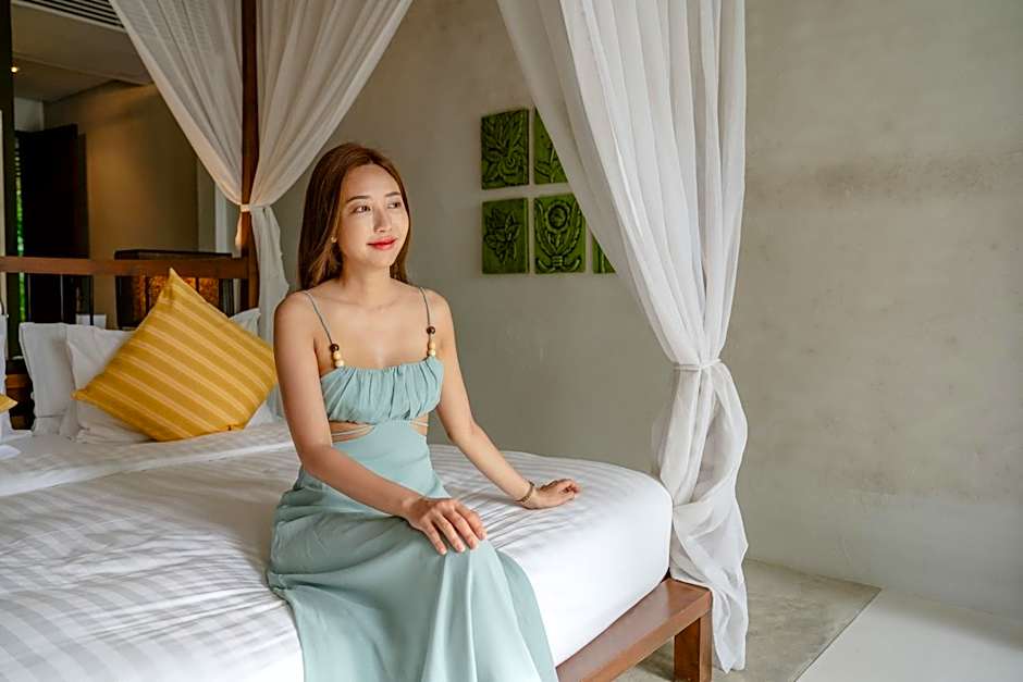 Luxurious villa features its own pool, outdoor bathtub, private pavilion surrounded by water lilly pond.